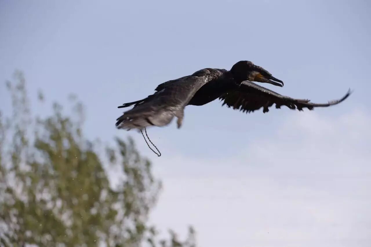 放鹰时,一声口令,鱼鹰“哑哑齐下”,墨色身形如黑云压城,遮住银鳞出没的湖面。不一会,鹰嘴里叼着鱼头钻出水来,鱼尾在湖面来回甩动,牧鹰人眼疾手快,一手把鱼头抄住,一手抓鹰,把鱼扔进舱里,顺手拿出一条小鱼填进鱼鹰嘴中,用手一抻皮条的活扣,鱼鹰的皮囊解开了,小鱼进入鹰嘴。然后用篙一架,把鹰放到架上休息。这一连串动作,麻利有序,没有一丝迟延。