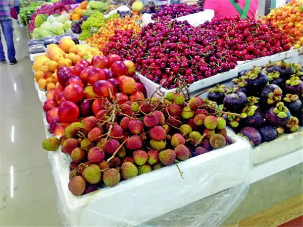 除了苹果、梨、香蕉等经常吃的果蔬之外,火龙果、芒果、荔枝、樱桃也都会应季供应。批发和零买都可以,水果蔬菜新鲜,价格又便宜。
